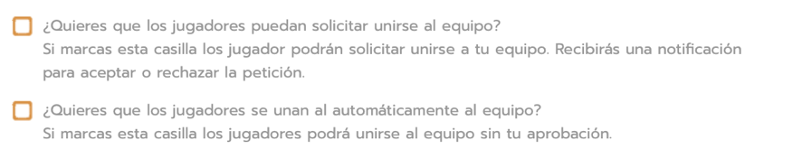 Puedes elegir entre que los jugadores se unan a su equipo mediante una solicitud, o bien automáticamente. En la opción manual recibirás una notificación para confirmar o denegar a un jugador su unión a un equipo. La opción automática permite al jugador unirse a un equipo sin previa aprobación por tu parte.